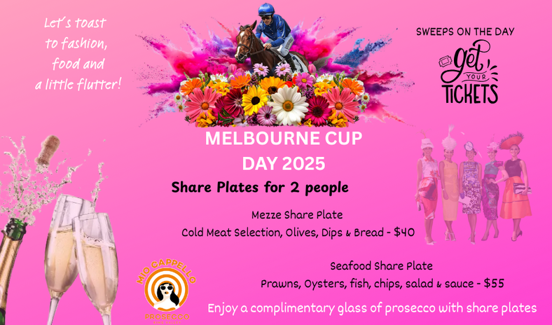 Enjoy delicious food, a glass of complimentary bubbles with share plates, and try your luck with a flutter on the Cup.